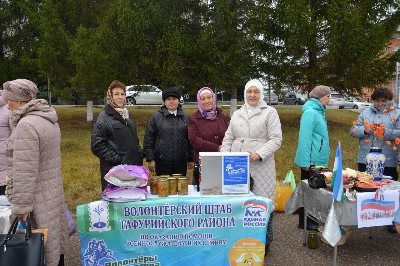 Также пришедшие на главную площадь райцентра жители и гости района могли принять участие в благотворительной акции по сбору гуманитарной помощи землякам-участникам СВО "Тепло для героя - с теплом родного края", организованной местным отделением Волонтёрского штаба им. М. Шаймуратова. Люди несли продукты питания, одежду, предметы гигиены, постельное белье и т.д., передавали денежные средства для бойцов-земляков, на которые волонтёры закупят всё необходимое. Здесь же можно было лично упаковать посылки, написать пожелания участникам СВО и т.д. Многие воспользовались такой возможностью.